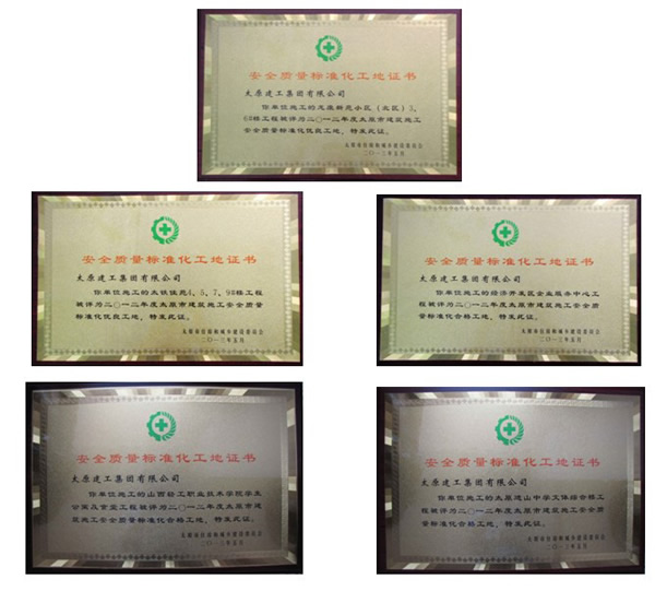 集團公司承建的太鐵佳苑4#、5#、7#、9#樓、龍康新苑小區(北區)3#、6#樓被評為二0一二年度太原市建筑施工安全質量標準化優良工地,山西輕工職業技術學院學生公寓及食堂、太原進山中學文體綜合樓、經濟開發區企業服務中心被評為二0一二年度太原市建筑施工安全質量標準化合格工地。